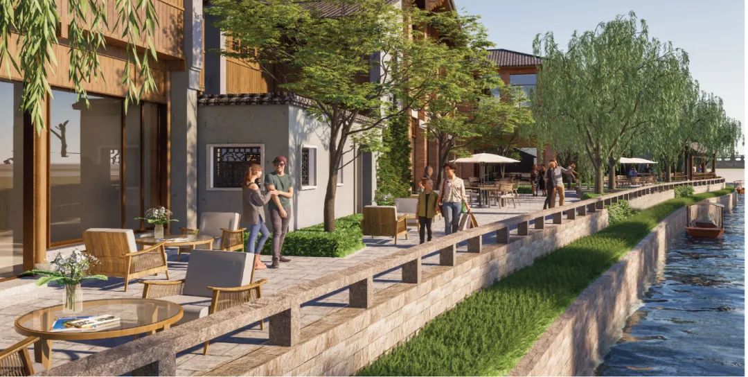 沿河界面打开,局部采用架空灰空间,形成沿河商业面。未来还将结合水上活动,打造丰富的滨水商业与活动空间。