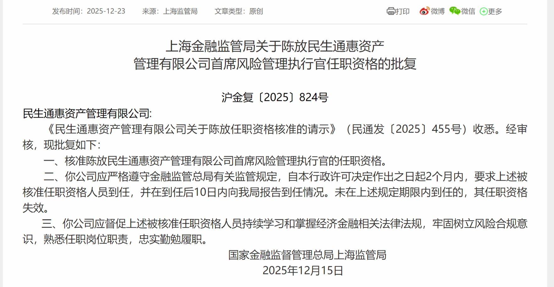 12月23日,上海金融监管局发布关于陈放民生通惠资产管理有限公司首席风险管理执行官任职资格的批复,核准陈放民生通惠资产管理有限公司首席风险管理执行官的任职资格。